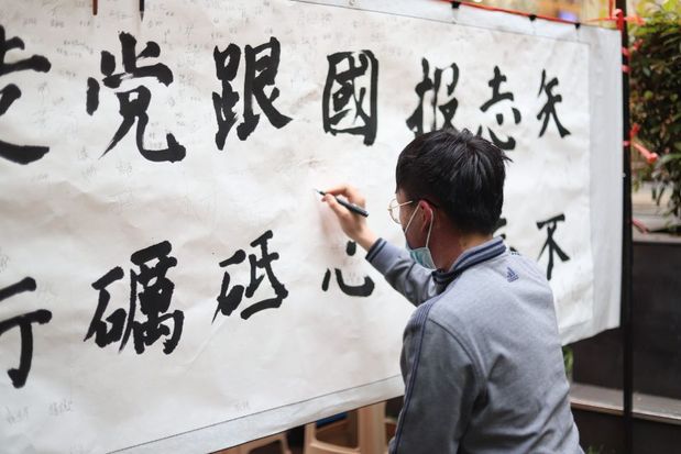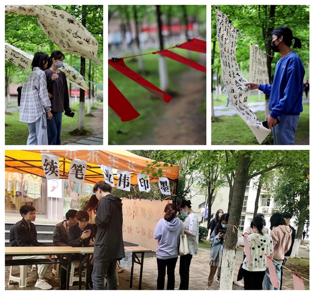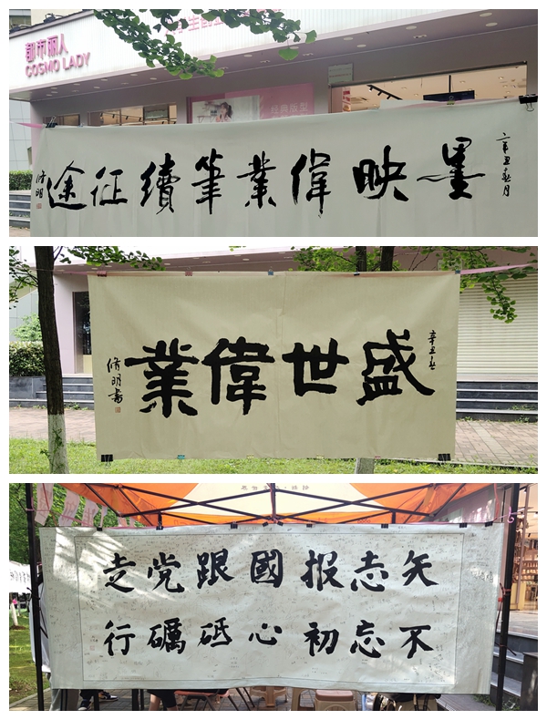 活动现场,悬挂展示了书法协会成员在红色宣纸上按时间顺序写就的建党百年来不同历史时期意义深远的会议和重大历史事件作品,跌宕蜿蜒的一片红色与葱郁的银杏林相映成趣,灵动的文化气息顿生。组织者邀请观展者一起品味经典、回顾峥嵘岁月,加深对百年辉煌党史的理解。在书法协会成员指导下,700余名乐于互动的观展者欣然签名,写下自己的理想抱负,抒发对中国共产党百年华诞的美好祝福。