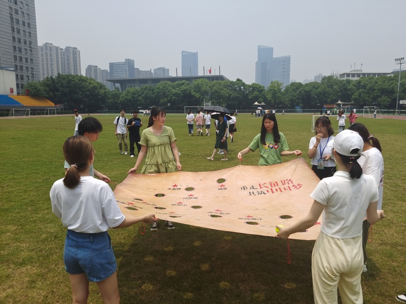 在“重走长征路”游戏中,参赛选手拉起一张“长征线路图”,裁判放上小球,参赛人员合力让小球沿着地图上的“长征”路线“行走”,小球到达终点即为挑战成功。这个游戏考验着团队成员协作能力和平衡能力。