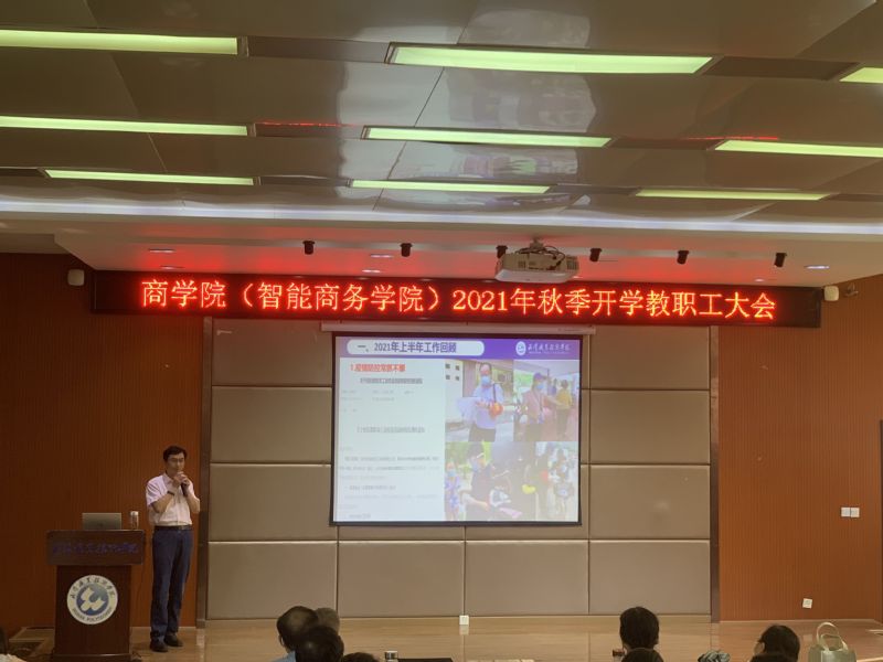 商学院院长兼智能商务学院院长孟凡中以《强能力、修品德、扩胸怀、提质量、谋发展、育人才》为题作报告。报告从疫情防控、工学结合、教学改革、书证融通、以赛促教、项目建设、队伍建设等七个方面总结了2021年上半年工作,充分肯定全体教职工干事创业的工作成绩;从招生就业、协同育人、成果培育、目标考核、师德思政、项目推进、迎接巡视等七个方面提出了新学期工作计划。孟凡中带领教师重温习总书记考察清华大学时的讲话,勉励全体教职工把握大势、勇于担当、善于作为。