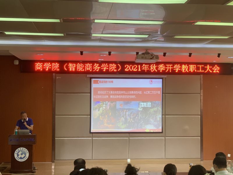 商学院分党委书记张幼华以《学习讲话精神 重温百年党史》为题,带领全体教职工集中政治学习。他讲到,从1921年到2021年,中国共产党走过了整整一百年的历程。这是苦难中铸就辉煌、挫折后毅然奋起、奋斗后赢得未来的百年。他强调全体教职工要以学党史为契机,加强思想淬炼、政治历练、实践锻炼、专业训练,为学校高质量发展贡献力量。
