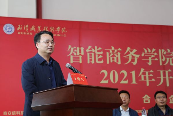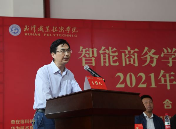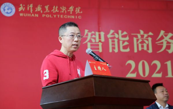 武汉跨境电商服务资源中心负责人、汉睿集团董事长、武汉跨境电商协会副会长张建波作为智能商务学院合作企业代表发言。他分享了企业视角下对人才的殷殷期盼,并表示将顺政策之势、行业之势,积极结合跨境电商行业及产业现状,协同武汉职业技术学院,培养出更多兼具专业知识和实操经验的行业人才。