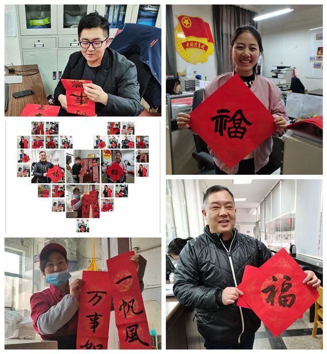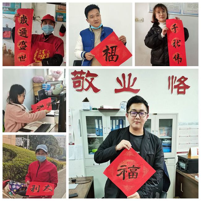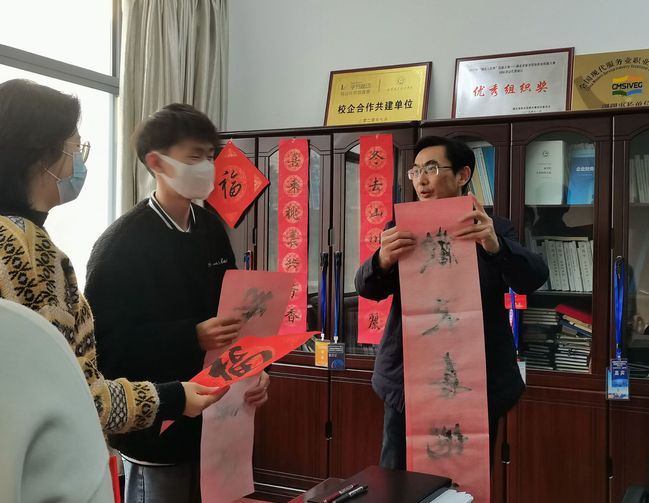 书法协会15名会员冒着严寒,带上课余时间书写的100余副春联和“福”字,走进一栋栋教学楼,走进各职能部门办公室,走进食堂、公寓,为坚守岗位默默奉献的教职工们送上美好祝福,表达感恩之情。