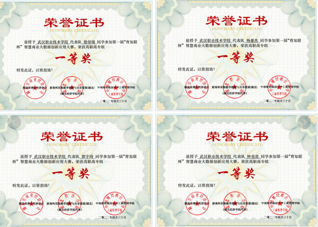 武职网讯(通讯员 张琴 刘超)4月30日,2022年第一届“育知联杯”智慧商业大数据创新应用大赛总决赛在“云端”举行。由智能商务学院2020级电子商务专业钟亮亮、郭宇琦,计算机技术与软件工程学院2020级大数据专业杨豪杰、殷侦瑞组成的武汉职业技术学院代表队,以优异表现荣获高职高专组总决赛一等奖和团体奖学金3000元。