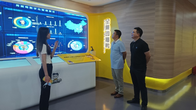 夏挺一行受到周黑鸭国际控股有限公司行政总裁助理王亚男及企业团队的热情接待,在讲解员带领下参观周黑鸭园区,包括生产车间、产品展示厅以及体验5D场馆、以及自动化生产加工线,了解企业新零售战略、企业岗位设置等方面情况,领略周黑鸭企业文化。