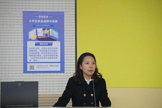 讲座现场,周蓉对中财协各位专家的到来表示欢迎。她勉励青春学子们及早做好职业生涯规划,多参加实践活动,重视综合素养培养,与人友好相处,学会分享,多听取意见和建议。