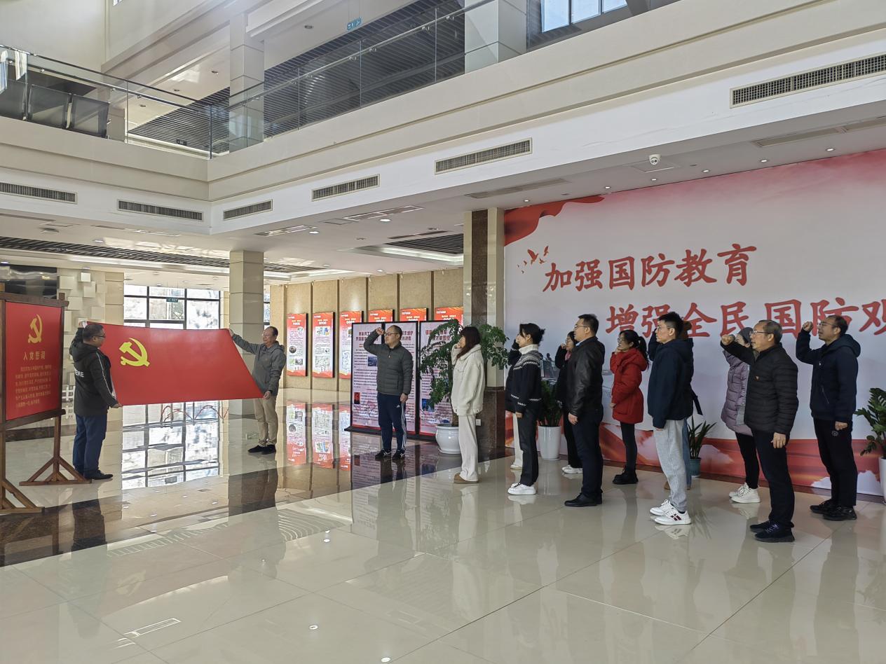 “我志愿加入中国共产党……” 在野战国防园国防教育馆大厅,全体党员在党旗下整齐列队,神情庄重,高举右拳,重温入党誓词,声音铿锵、洪亮是老师们向党表达不忘初心,坚守信仰的决心。