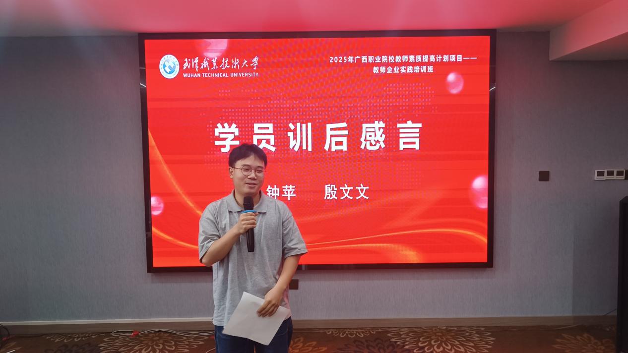 崇左幼儿师范高等专科学校教师殷文文代表全体学员对武汉职业技术大学培训团队的精心组织与辛勤付出表示衷心感谢。他表示,返岗后必将把培训所学转化为育人实践,将产业前沿理念和AI技术深度融入课堂,为培养更多高素质技术技能人才贡献力量。