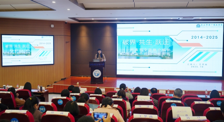武汉市第一商业学校党委书记艾翠林围绕“中高职全链融合赋能区域产业升级的创新实践”作专题报告。她从“破界、共生、跃迁”三个维度,结合产教融合案例,阐释了贯通式育人生态的构建策略和实践路径。