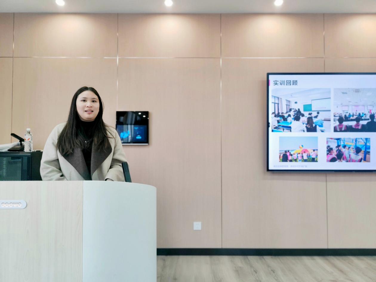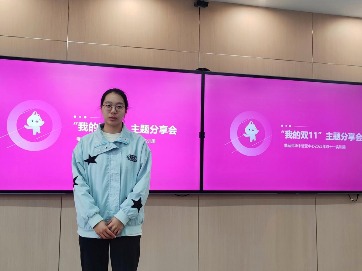 唯品会华中物流中心人事专员许青青对本次实训进行总结。她通过影像资料,回顾了学生从入职安全培训、岗位标准化学习,到在企业导师指导下逐步掌握拣选、打包、质检等全流程技能的成长足迹。许青青表示:“实训期间,同学们展现出高度的责任意识和职业素养,吃苦耐劳、勤勉务实,为应对‘双十一’物流高峰提供了有力支持。”