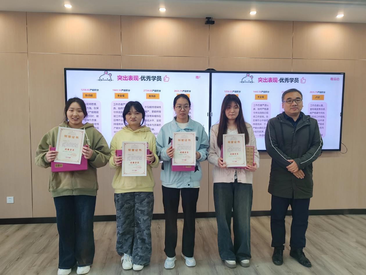表彰环节,许青青宣读企业表彰决定。许晨曦、姚铭因在产能方面的突出表现获评“产能之星”;耿诗颖、李全菊、黄先珍、卢好荣获“优秀学员”称号,获奖学生均获得唯品会认证的实训证书和奖品,部分优秀学生还将获得企业提供的实习与就业绿色通道。