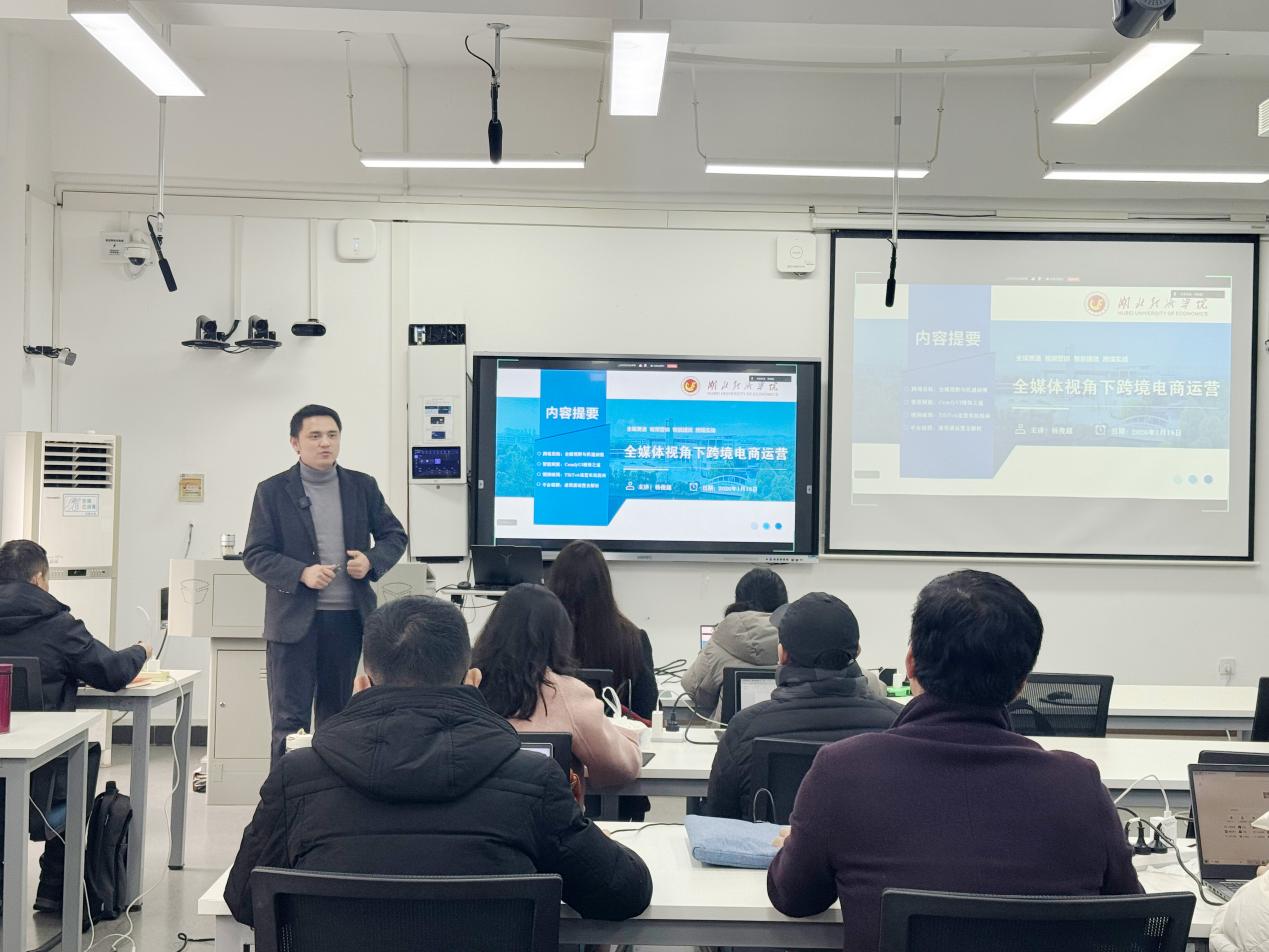 新闻网讯(通讯员刘书琴)近日,湖北经济学院外国语学院主办的“人工智能大模型赋能教育应用技能提升师资培训班”在武汉顺利举行。武职大智能商务学院杨俊超老师凭借在跨境电子商务与新媒体领域的深厚积淀,获邀担任培训授课专家,为湖北经济学院外国语学院的骨干教师带来了题为《全媒体视角下跨境电商运营》的专题授课。